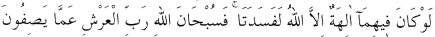 "Eğer göklerde ve yerde Allah’tan başka ilâhlar olsaydı, ikisi de harap olup giderdi. Arşın Rabbi olan Allah, onların yakıştırdıkları şeylerden münezzehtir." Enbiyâ Sûresi, 21:22.