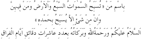 Öyle bir zâtın adıyla ki, "Yedi gökle yer ve onların içinkiler Onu tesbih eder. Hiçbir şey yoktur ki Onu övüp Onu tesbih etmesin." (İsrâ Sûresi, 17:44.) Ayrılık günlerindeki dakilaların âşireleri sayısınca Allah’ın selâmı, rahmeti ve bereketi üzerinize olsun.