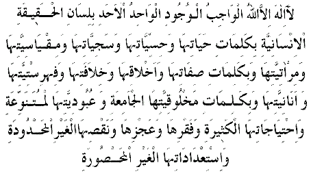 Hayatı, hissiyatı, seciyeleri, mikyaslığı ve ayineliği kelimeleriyle, ve sigatları, ahlakı, halifeliği, firhisteliği ve eneniyeti kelimeleriyle; ve cami mahlukiyeti, mütenevvi ubudiyeti, ihtiyacatı kesiresi, fakrı, aczi, gayr-i mahdut naksı, gayr-iı mahsur istidatlar kelimeleriyle lisan-i hakikat-ı insaniyenin şehadetiyle, Vacibü l-Vücud ve Vahidü l-Ehad olan Allh tan başka hiçbir ilan yoktur.