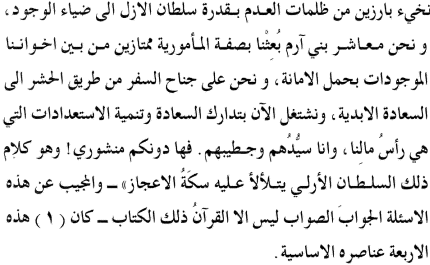 Emmâ ba’dü biliniz ki: Evvela bu yazacağımız işârât ve nüktelerdeki maksadımız Kur’ân’ın nazmındaki bir kısım remizlerinin tefsiridir. Çünkü, yedi nev’i i’câzın en incesi, fakat kuvvetli ve lâfzî fakat hakikatli i’câz, Kur’ân’ın nazmından tecelli ediyor. Evet, parlak i’câz elbette nazmın nakşından çıkıyor.