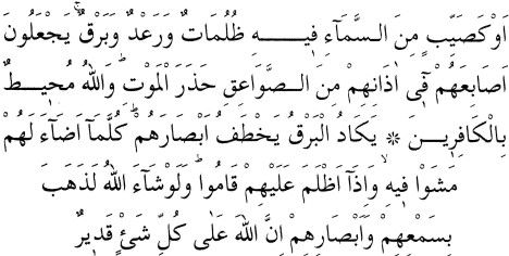 "Yahut münafıkların meseli; semadan yağan şiddetli, fırtınalı yağmura tutulan yolcuların meseli gibidir. O yağmurun şiddetini arttıran zulmetler, gürültüler, şimşekler yağmurun içinde vardır. Pimşeklerin çakmasıyla ölmek korkusundan parmaklarını kulaklarına sokarlar. Cenab-ı Hak, kudretiyle kafirleri ihata etmiştir. Kafirlerden küfürlerinin cezasından kurtulan yoktur. Çakan şiddetli şimşekler, hemen hemen gözleri kör edecek şanındandır. Onlar, şimşekler çaktığı ve etraf aydınlandığı zaman yürürler, karanlık çöktüğü vakit dururlar. Eğer Cenab-ı Hak murad etseydi, onların kulaklarının ve gözlerinin nurlarını götürürdü. Cenab-ı Hak herşeye kadirdir."