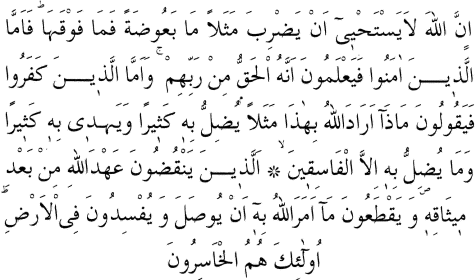 Yani, "Cenab-ı Hak, kullarını irşad ve ikaz etmek üzere, sivrisinek gibi hakir, kıymetsiz bir hayvanla veya bir mahlukla misal getirmeyi, kafirlerin keyfi için terk etmez. İmanı olanlar, onun, Rablerinden hak olduğunu bilirler. Amma kafirler, ’Allah bu gibi hakir misallerden neyi irade etmiştir?’ diyorlar. Allah, onunla çoklarını dalalete atar ve çoklarını da hidayete götürür. Fakat fasıklardan maada dalalete attığı yoktur. Fasıklar da ol adamlardır ki, Allah’ın taatinden huruçla, misak-ı ezeliden sonra ahidlerini bozarlar ve Allah’ın akrabalar arasında veya mü’minler beyninde emrettiği hatt-ı muvasalayı keserler; yeryüzünde işleri ifsattır. Dünya ve ahirette zarar ve hüsrana maruz kalan ancak onlardır."