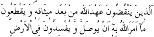 1 O fasıklar ki, Allaha verdikleri sözü bozar, Allahın akrabalar ve müminler arasında riayet edilmesini emrettiği keser ve yeryüzünde fesat çıkarırlar. (Bakara Suresi: 27.)