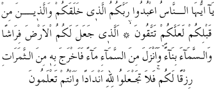 Yani, "Ey insanlar! Sizi ve sizden evvelkileri yaratan Rabbinize ibadet ediniz ki, takva mertebesine vasıl olasınız. Ve yine Rabbinize ibadet ediniz ki, arzı size döşek, semayı binanıza dam yapmış ve semadan suları indirmiş ki, sizlere rızık olmak üzere yerden meyve ve sair gıdaları çıkartsın. Öyleyse, Allah’a misil ve şerik yapmayınız. Bilirsiniz ki, Allah’tan başka mabud ve halıkınız yoktur."