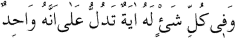 Nev-i beşer ile sair hayvanatın medar-ı maişetleri olan semeratın tevlidi için, arz ile sema arasındaki muavenet ve münasebetleri ve asar-ı alemin birbirine müşabehetleri ve etraf-ı alemin birbiriyle kucaklaşmaları ve birbirinin elini tutup ihtiyaçlarını temin etmeleri ve yekdiğerinin sualine cevap verip yardımına koşmaları ve tamamıyla bir nokta-i vahideye bakmaları ve bir Nazzam-ı Vahidin mührü üstünde hareket etmeleri gibi halleri havi olan böyle garip bir makine, sahip ve Saniinin bir olduğunu kat’i bir şehadetle ilan etmekle, "Herbir şeyde, Saniin vahdetine delalet eden bir ayet ve bir alamet vardır" manasında olan şu beyitle tanin-endaz oluyorlar: