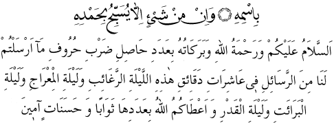 Bize, gönderdiğiniz Risale-i Nur’ların harfleriyle, bu Regaib Kandili, Miraç ve Kadir gecelerinin dakikalarındaki âşirelerin çarpımı adedince Allah’ın selamı, rahmeti ve bereketi üzerinize olsun, Cenab-ı Hak size bir o kadar sevap ve hasene ihsan etsin. Amin.