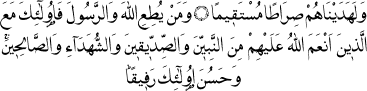 1 "Muhakkak onları doğru yola iletiriz. Her kim Allah’a ve Peygambere itaat ederse, işte onlar, Allah’ın kendilerine pek büyük nimetler bağışladığı peygamberler, sıddıklar, şehidler ve salih kimselerle beraberdirler. Ne güzel arkadaştır onlar!" Nisâ Sûresi, 4:68-69.