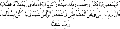 "Kâf hâ yâ ayn sâd. Bu âyetler, kulu Zekeriya’ya Rabbinin rahmetini zikirdir. Hani o Rabbine gizlice niyaz ederek demişti ki: Ey Rabbim, artık benim kemiklerim yıprandı, başım ihtiyarlıkla tutuşup saçlarım aklandı. Sana ettiğim dualarımda da, ey Rabbim, ben hiç mahrum kalmadım." Meryem Sûresi, 19:1-4.
