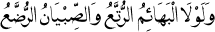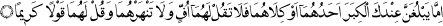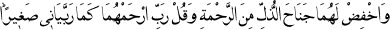 "Onlardan biri veya her ikisi senin yanında ihtiyarlık çağına erişecek olursa, onlara sakın ’Öf’ bile deme, onları azarlama; onlara güzel söz söyle. Onlara merhamet ve tevazu kanadını ger ve de ki: ’Ey Rabbim, nasıl onlar beni küçükken besleyip büyüttülerse, Sen de onlara öylece merhamet buyur.’" İsrâ Sûresi, 17:23-24.