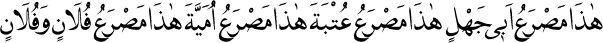 3 Hadis-i bilmânâdır. Meâli: "Burası Ebû Cehil’in katledileceği yer, burası Utbe’nin katledileceği yer, burası Ümeyye’nin katledileceği yer ve burası da falan ve falanın katledileceği yerlerdir." Müslim, Cihad: 83, Cennet: 76; Ebû Dâvud, Cihad: 115; Nesâi, Cenâiz: 117; Müsned, 1:26, 3:219, 258.