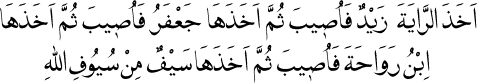 4 "Sancağı Zeyd aldı ve vuruldu. Sonra Câfer aldı, o da vuruldu. Sonra İbni Revâha aldı, o da vuruldu.. Ve sonra onu, Allah’ın kılıçlarından bir kılıç eline aldı..." Buharî, Mağâzî: 44; el-Hâkim, el-Müstedrek, 3:298.
