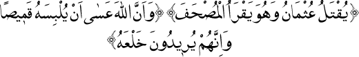 3 "Osman Mushaf okurken şehid edilecek." el-Hâkim, el-Müstedrek, 3:103. "Muhakkak ki Cenab-ı Hak Osman’a halife gömleğini giydirecektir; fakat onlar bu gömleği çıkartmak isteyecekler." Bkz. el-Hâkim, el-Müstedrek, 3:100.