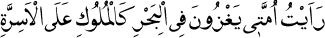 3 "Rüyâmda ümmetimin gazilerini gördüm. Tahtlarına oturmuş padişahlar gibi denizde savaşarak yollarına devam ediyorlardı." Buharî, Ta’bîr: 12; Cihad: 3, 8, 63, 75; İsti’zân, 41; Müslim, İmâret: 160, 161; Ebû Dâvud, Cihad: 9; Tirmizî, Fedâilü’l-Cihad: 15; Nesâî, Cihad: 40; İbni Mâce, Cihad: 10; Dârîmî, Cihad: 28; Muvatta’, Cihad: 39; Müsned, 3:240, 264 ...; el-Elbânî, Sahîhu’l-Câmiü’s-Sağîr, 6:24, no: 6620; el-Hâkim, el-Müstedrek, 4:556.