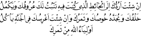 Yani, "Cennette beni dik ki, benim meyvelerimden, Cenâb-ı Hakkın sevgili kulları yesin. Hem bir mekân ki, orada beka bulup, çürümek yoktur." Resul-i Ekrem Aleyhissalâtü Vesselâm ferman etti: