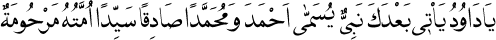 1 "Yâ Davud! Senden sonra, Ahmed, Muhammed, Sâdık ve Seyyid olarak anılacak bir peygamber gelecek. Onun ümmeti Allah’ın rahmetine mazhar olacak." Halebî, es-Sîretü’l-Halebiye, 1:353; Kandehlevî, Hayâtü’s-Sahâbe, 1:18; İbni Kesîr, el-Bidâye ve’n-Nihâye, 2:326; Ali el-Kari, Şerhu’ş-Şifâ, 1:739; Nebhânî, Hüccetüllah ale’l-Âlemîn, 122.