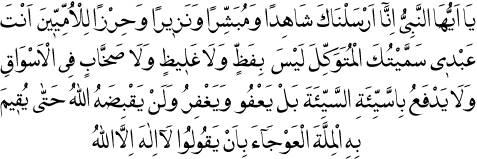 2 "Ey Peygamber! Muhakkak ki Biz seni bir şahit, bir müjdeleyici, bir sakındırıcı ve ümmîler için bir dayanak olarak gönderdik. Sen Benim kulumsun ve sana Mütevekkil ismini verdim. Sen ne katı kalbli, ne huysuz ve ne de sokaklarda böbürlenerek yürüyen biri değilsin. Sen kötülüğe kötülükle de karşılık vermezsin. Sen affeden ve bağışlayan bir peygambersin. Eğriliğe girmiş olan halk onunla yolunu doğrultuncaya ve ’Lâilâhe İllallâh’ deyinceye kadar Allah o peygamberin ruhunu almaz." Buharî, Büyû’: 5; Burhâneddin Halebî, es-Sîretü’l-Halebiye, 1:346; Dârîmî, Mukaddime: 2; Kandehlevî, Hayâtü’s-Sahâbe, 1:17; İbni Kesîr, el-Bidâye ve’n-Nihâye, 2:326; Nebhânî, Hüccetüllah ale’l-Âlemîn, 105, 135; el-Acurrî, eş-Şerî’a, 444, 452; Kastalânî, el-Mevâhibü’l-Ledünniye, 6:192.