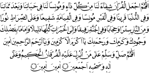 1 Allahım! Kur’ân’ı, bizim için, onu yazan ve benzerleri için, her türlü hastalıktan şifâ, bize ve onlara hem dünyada, hem de âhirette dost, dünyada yoldaş, kabirde arkadaş, Kıyâmette şefaatçi, Sırat üzerinde nur, Cehenneme karşı perde ve örtü, Cennette arkadaş ve bütün hayırlara bizi sevk eden rehber ve önder kıl. Bunu fazlın, cömertliğin, keremin ve rahmetinle yap ey merhametlilerin en merhametlisi ve ey bütün cömertlerden daha cömert olan! Duâmızı kabul buyur.