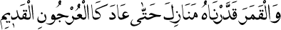4 Aya gelince, onun için de menziller takdir ettik ki, kurumuş hurma dalının ince yay hâlini alıncaya kadar incelir. (Yâsin Sûresi: 39.)