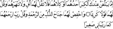 4 Anne ve babadan biri veya her ikisi senin yanında ihtiyarlık çağına erişecek olursa, onlara sakın"Öf’ bile deme, onları azarlama, onlara güzel söz söyle. · Onlara merhamet ve tevâzu kanadını ger ve de ki: "Ey Rabbim, nasıl onlar beni küçükken besleyip büyüttülerse, Sen de onlara öylece merhamet buyur." (İsrâ Sûresi: 23-24.)