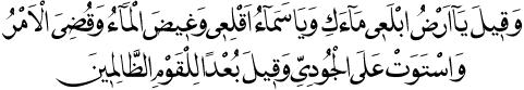 1 "Ve denildi ki: ’Ey yer, suyunu yut. Ey gök, suyunu tut.’ Su çekildi, iş bitirildi ve gemi Cûdî Dağına oturdu. Ve ’Zalimler güruhu Allah’ın rahmetinden uzak olsun’ denildi." Hûd Sûresi, 11:44.