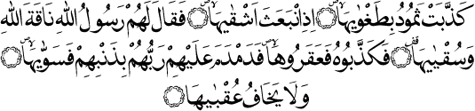 2 "Semud kavmi, azgınlığı yüzünden peygamberini yalanladı. Onların en azgını başkaldırdığı zaman, Allah’ın Resulü kendilerine ’Allah’ın bir mucize olarak yarattığı şu deveye dokunmayın; onun su içmesine mâni olmayın’ demişti. Onlar peygamberlerini yalanlayıp deveyi öldürdüler. Rableri de, günahları yüzünden onları azapla kuşatıp hepsini birden helâk etti. Allah onlara verdiği cezanın âkıbetinden korkacak değildir." Şems Sûresi, 91:11-15.