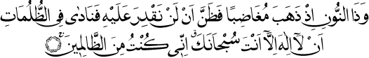 3 "Balığın yuttuğu Yunus’u da hatırla ki, öfkelenerek kavmini terk etmiş ve Bizim de kendisini bu yüzden bir sıkıntıya uğratmayacağımızı sanmıştı. Sonra karanlıklar içinde kaldığında niyaz etti: ’Senden başka ilâh yoktur; Seni her türlü noksandan tenzih ederim. Gerçekten ben kendisine zulmedenlerden oldum.’" Enbiyâ Sûresi, 21:87.