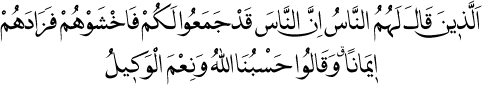 "Onlar öyle kimselerdir ki, insanlar onlara ’Düşman size karşı büyük bir kuvvet topladı; onlardan korkun’ dedikleri zaman onların imanı ziyadeleşti ve ’Allah bize yeter; O ne güzel vekildir’ dediler." Âl-i İmrân Sûresi, 3:173.