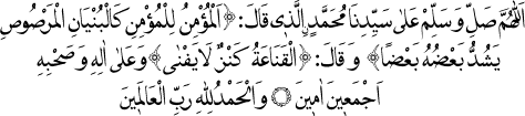 Allahım! "Mü’minler sağlam bir binanın taşları gibidir; birbirlerine kuvvet verirler." Ve "Kanaat tükenmez bir hazinedir" [Süyûti, el-Fethü’l-Kebîr, 2:309) buyuran Efendimiz Muhammed’e ve bütün âl ve ashabına salât ve selâm et. Âlemlerin Rabbi olan Allah’a hamd olsun.