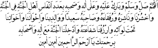 Allahım! Ona, âline ve ashabına, Cennetteki ehl-i Cennetin nefesleri sayısınca salât ve selâm et ve bereket ihsan et. Bizi, bu kitabın naşirini, arkadaşlarını, sahibi olan Said’i, anne ve babalarımızı, erkek ve kız kardeşlerimizi, onun sancağı altında saidler olarak haşret; bizi onun şefaatiyle rızıklandır; bizi, onun âl ve ashabıyla beraber, rahmetinle Cennete koy, ey Erhamürrâhimîn. Âmin, âmin.
