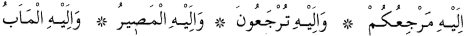 "Dönüş Onadır." Ra’d Süresi, 13:36. "Herkesin dönüşü Onun huzurunadır." Maide Süresi, 5:18. "Hepinizin dönüşü Onadır." Bakara Süresi, 2:245. "Hepinizin dönüşü Onadır." Hüd Süresi, 10:4.