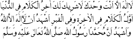 Senden başka ilâh yoktur. Sen birsin. Senin hiçbir şerikin yoktur. Dünyada son, âhirette ve kabirde ilk söz: Şehadet ederim ki Allah’tan başka ilâh yoktur; yine şehadet ederim ki Muhammed (s.a.v.) Allah’ın Resulüdür.