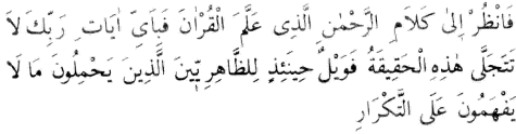 1 Kur’ân’ı öğreten Rahmân’ın kelâmına bir bak: Rabbinin âyetlerinden hangi biri var ki, bu hakikat onda tecellî etmesin? Yazıklar olsun o zahirperestlere ki, anlamadıkları şeyi tekrara hamlederler.
