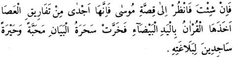 Bu hakikati görmek istersen, kıssa-i Mûsâ’ya bak. Bu kıssanın tamamında, onun herbirinden daha büyük bir kuvvet vardır ki, Kur’ân onu yed-i beyzâsına aldığı vakit, ilm-i beyanın sâhirleri, onun belâgatine hayran kalmış ve muhabbetle secdeye varmışlardır.