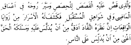 Ona bu kıssaları hikâye ederek ruhunu mâzinin derinliklerinde ve istikbalin şahikalarında gezdiren ve hadisatın karanlık köşelerindeki esrar perdesini onun için kaldırana yemin olsun ki, onun keskin gözü kendisini şaşırtmayacak kadar dikkatli, onun hak olan mesleği ise insanları aldatmaktan uzaktır.