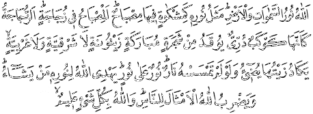 * Allah göklerin ve yerin nûrudur. Onun nûrunun misâli, bir lâmba yuvası gibidir ki, onda bir kandil vardır. Kandil de cam fânus içindedir. Cam fânus ise, inci gibi parlayan bir yıldıza benzer ki, ne doğuya, ne de batıya âit olmayan mübârek bir ağacın yakıtından tutuşturulur. Onun yakıtı, kendisine ateş dokunmasa bile ışık verecek kabiliyettedir. O nûr üstüne nûrdur. Allah dilediğini nûruna kavuşturur. İnsanlara Allah böyle misaller verir. Çünkü Allah her şeyi hakkıyla bilendir. Nur Sûresi, 24:35.