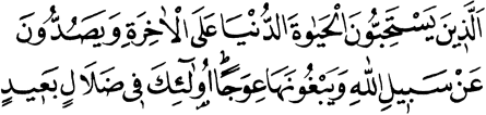 * Onlar dünya hayatını seve seve âhrete tercih ederler, halkı Allah yolundan alıkoyarlar ve doğru yolu eğri göstermeye çalışırlar. Öyleleri, haktan pek uzak bir sapıklık içindedirler. İbrahim Sûresi, 14:3.