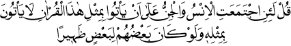 De ki: And olsun, eğer bu Kur’ân’ın benzerini getirmek için insanlar ve cinler bir araya toplanıp da hepsi birbirine yardımcı olsalar, yine de onun benzerini getiremezler. (İsrâ Sûresi: 88.)