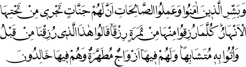 1 İmân edenler ve güzel işler yapanları müjdele: Altlarından ırmaklar akan Cennetler onlarındır. O Cennetlerden rızık olarak bir meyve yediklerinde, "Bu daha önce yediğimiz rızıktandır" derler. Rızıkları dünyadakine benzer şekilde kendilerine sunulur. Orada onlar için ter temiz eşler vardır. Onlar orada ebedî olarak kalacaklardır. (Bakara Sûresi: 25.)