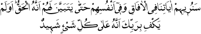 Onlara gerek içinde yaşadıkları âlemin her tarafìnda, gerekse kendi nefislerinde âyetlerimizi göstereceğiz-tâ ki Kur’ân’ın hak olduğu onlara iyice açıklanmış olsun. Rabbinin her şeye şahit olması yetmez mi? (Fussılet Sûresi: 53.)