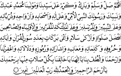 4 Allahım, ümmî peygamber, elçin, peygamberin ve kulun olan Efendimiz ve Dostumuz Muhammed’e, onun âline, Ashâbına, hanımlarına, nesline; peygamber ve resûllere, kendine mânen yaklaştırdığın meleklere, dostlarına ve sâlih insanlara salât, selâm bereket ve kerem ihsan eyle. Bu Kur’ân’ın sûreleri, âyetleri, harfleri, kelimeleri, mânâları, işaretleri, remizleri ve delâletleri adedince en üstün salât, en bol selâm, en büyük bereketler halinde olsun. Ey İlâhımız, ey Yaratıcımız, ey merhamet edenlerin en merhametlisi! Bu salâvâtlardan her birisi hürmetine bizi bağışla, bize merhamet et, bize lûtufta bulun. âlemlerin Rabbi olan Allah’a hamd olsun. âmin.