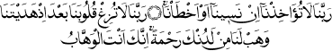 Ey Rabbimiz! Bizi doğru yola eriştirdikten sonra kalblerimizi sapıklığa meylettirme. Yüce katından bize bir rahmet bağışla. Muhakkak ki veren Sensin, duâ edip istediklerimizi bize bağışlayan Sensin. (Al-i İmrân Sûresi: 8.)