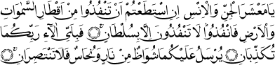 1 Ey cinler ve insanlar topluluğu! Eğer göklerin ve yerin sınırlarından çıkıp gitmeye gücünüz yeterse, haydi, çıkın. Fakat Allah’ın vereceği bir kuvvet olmadan çıkamazsınız. • Rabbinizin ni’metlerinden hangi birini inkâr edersiniz? • Üzerinize saf ateşten bir alevle bakır gibi kızıl bir duman salınır da, birbirinize hiçbir yardımınız dokunmaz. (Rahmân Sûresi: 33-35.)