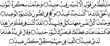 2 İnsanın ağzından hiçbir söz çıkmaz ki, yanında onu yazmaya hazır, gözetleyici bir melek olmasın. • Derken ölüm sarhoşluğu gerçekten geliverir. İşte senin kaçıp durduğun şey budur. • Ve Sûr’a üfürülür. Vaad olunan gün işte budur. • Herkes yanında bir sevk eden, bir de şâhidlik eden melekle beraber gelir. • And olsun ki sen bundan gàfildin. Şimdi gözünden perdeyi kaldırdık. Bugün bakışın pek keskindir. • Yanındaki melek "İşte onun defteri bende hazırdır" der. • Atın Cehenneme, her bir inatçı kâfiri! (Kaf Sûresi: 18-24.)