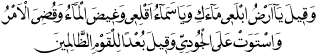 3 Ve denildi ki: "Ey yer, suyunu yut. Ey gök, suyunu tut." Su çekildi, iş bitirildi ve gemi Cûdî Dağına oturdu. Ve "Zâlimler gürûhu Allah’ın rahmetinden uzak olsun" denildi. ( Hûd Sûresi: 44.)