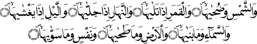 Yemin olsun güneşe ve aydınlığına. • Ve onu takip eden aya. • Ve onu gösteren güne. • Ve onu örten geceye. • Ve gökyüzüne ve onu binâ edene. • Ve yeryüzüne ve onu yayıp döşeyene. • Ve insana ve onu intizamla yaratana. (Şems Sûresi: 1-7.)