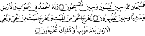 Akşama erdiğinizde ve sabaha kavuştuğunuzda Allah’ı tesbih edin. • Göklerde ve yerde olanların hamd ve senâsı Ona mahsustur. Gündüzün sonuna doğru ve öğle vaktine erişince de Allah’ı tesbih edip namaz kılın. • Ölüden diriyi, diriden ölüyü O çıkarır. Ölümünden sonra yeryüzünü O diriltir. Siz de kabirlerinizden böyle çıkarılacaksınız. (Rûm Sûresi: 17-19.)