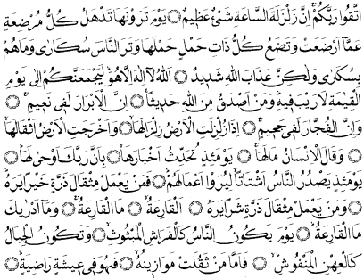 Ne zaman ki yer müthiş bir sarsıntıyla sarsılır. • Ve yer bütün ağırlıklarını dışarı çıkarır. • Ve insan "Ne oluyor buna?" der. • O gün yer, üzerinde herkesin ne iş yaptığını haber verir. • Çünkü Rabbin ona konuşmasını emretmiştir. • O gün insanlar amelleri kendilerine gösterilmesi için hesap yerine bölük bölük dönerler. • Kim zerre kadar bir iyilik yaparsa onun mükâfâtını görür. • Kim zerre kadar bir kötülük yaparsa onun cezasını görür. (Zilzâl Sûresi: 1-8.)