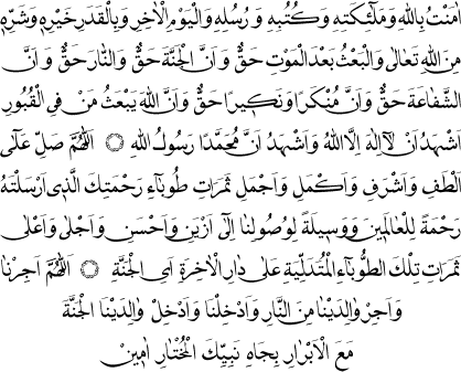 2 Allah’a, meleklerine, kitaplarına, peygamberlerine, âhiret gününe, kadere, hayır ve şerrin Allah’tan geldiğine inandım. Hiç şüphesiz öldükten sonra diriliş haktır, Cennet haktır, Cehennem haktır, şefaat haktır, Münker ve Nekîr melekleri haktır. Allah’ın kabirlerdeki ölüleri tekrar dirilteceğine imân ettim. Allah’tan başka ibâdete lâyık hiçbir ilâh olmadığına ve Muhammed’in (a.s.m.) Allah’ın resûlü olduğuna şehâdet ederim.