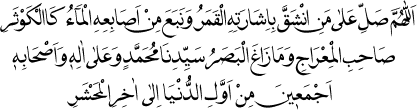 1 Allah’ım, işaretiyle ayın ikiye bölündüğü, parmaklarından suyun Kevser gibi aktığı, Mi’racın ve "Gözü şaşmadı" (Necm Sûresi: 17) âyetinin sahibi Efendimiz Muhammed’e, Onun bütün âl ve Ashâbına dünyanın evvelinden mahşerin sonuna kadar rahmet eyle.
