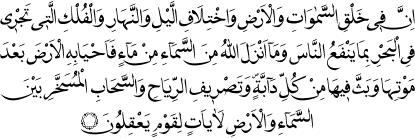 Göklerin ve yerin yaratılmasında, gecenin ve gündüzün değişmesinde, insanlara faydalı şeylerle denizde akıp giden gemilerde, Allah’ın gökten su indirip onunla yeryüzünü ölümden sonra diriltmesinde, her türlü canlıyı yeryüzüne yaymasında, rüzgarları sevk etmesinde ve gökle yer arasında Allah’ın emrine boynun eğmiş bulutlarda, aklını kullanan bir topluluk için Allah’ın varlık ve birliğine, kudret ve rahmetine işaret eden nice deliller vardır. (Bakara Suresi: 164.)